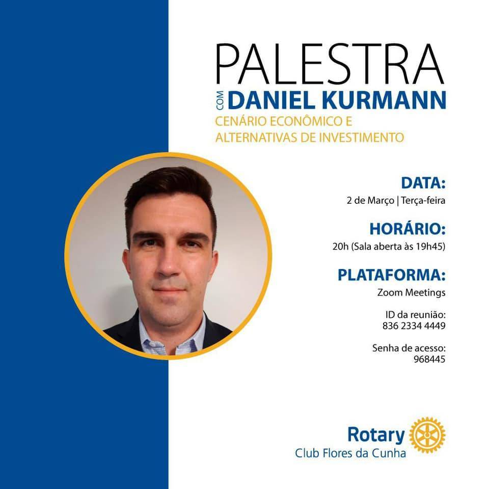 O Rotary Club de Flores da Cunha promoveu nesta terça-feira à noite, uma palestra sobre o “Cenário Econômico e as alternativas de Investimento” tendo como palestrante o consultor de investimentos do banco Sidredi DANIEL KURMANN. A palestra contou com a presença de diversos rotarianos dos clubes pertencentes à área 4. Prestigiaram o evento a Governadora Assistente, Eveline Camassola e a Past Governadora, Patrícia Camassola, ambas companheiras do Rotary Club São Marcos.