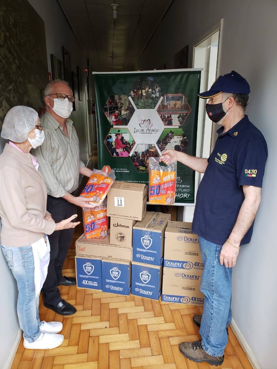 Produtos de higiene e limpeza para controle dos efeitos da pandemia aos assistidos pela Fundação Lucas Araujo, adquiridos com recursos do Distrito e aporte do Clube.