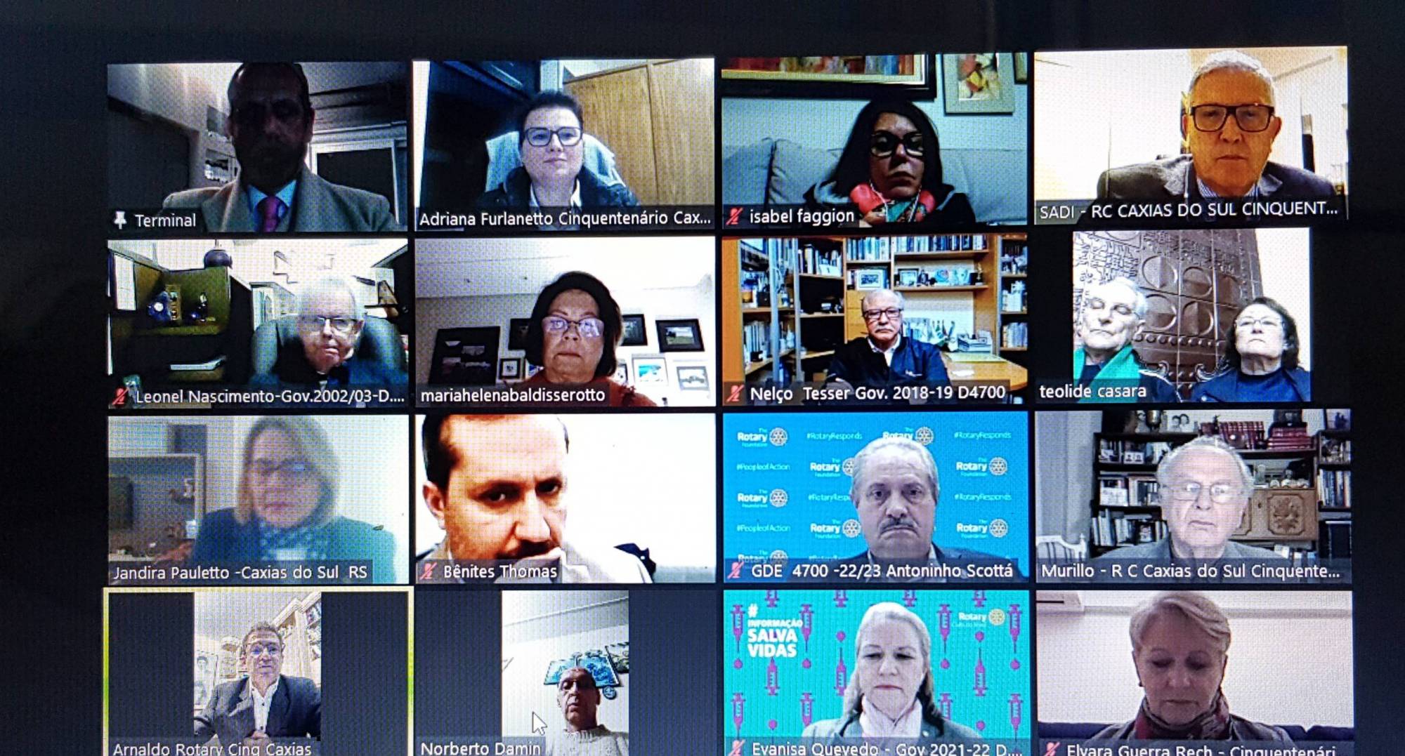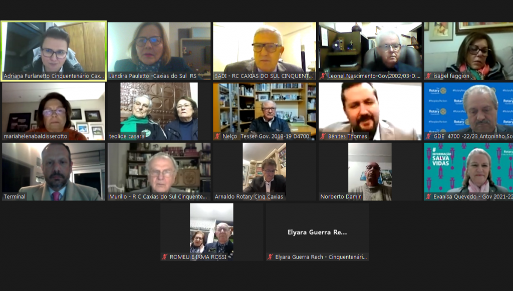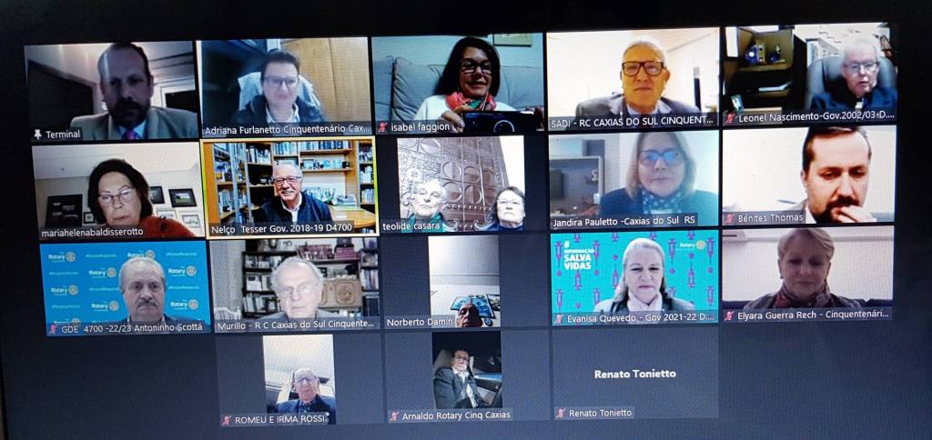 REUNIÃO DE ORDINÁRIA DE 15.09.2021 - Visita da Gov.de Rotary-Distrito 4700 Sra Evanisa F. Quevedo Melo- Em reunião no modo online, a Presidente Adriana Furlanetto, deu as boas vindas à governadora e aos presentes. Além dos companheiros de Clube. prestigiaram também a reunião os pas- governadores: Nelso Nelço Angelo Tesser,Leonel Nascimento,Romeu V.Rossi, o futuro gov. Antoninho Scotá e o Gov.Assistente Bênites. Usaram da palavra os companheiros: Geison Fernando Vidor,responsável pelo DQA, o futuro presidente Arnaldo Ivan Velho Castilhos, responsável pela Fundação Rotária e a companheira Jandira Pauletto, responsável pelos Projetos.Humanitários. Governadora Evanisa fez uso da palavra, enfatizando a necessidade do engajamento de todos para que o Distrito 4700, possa cumprir as metas de Rotary Internacional. O protocolo, companheiro Sadi G Rech, conduziu a reunião e no final a Pres. Adriana encerrou , com agradecimentos a todos os presentes em especial à Gov.Evanisa.REUNIÃO DE ORDINÁRIA DE 15.09.2021 - Visita da Gov.de Rotary-Distrito 4700 Sra Evanisa F. Quevedo Melo- Em reunião no modo online, a Presidente Adriana Furlanetto, deu as boas vindas à governadora e aos presentes. Além dos companheiros de Clube. prestigiaram também a reunião os pas- governadores: Nelso Nelço Angelo Tesser,Leonel Nascimento,Romeu V.Rossi, o futuro gov. Antoninho Scotá e o Gov.Assistente Bênites. Usaram da palavra os companheiros: Geison Fernando Vidor,responsável pelo DQA, o futuro presidente Arnaldo Ivan Velho Castilhos, responsável pela Fundação Rotária e a companheira Jandira Pauletto, responsável pelos Projetos.Humanitários. Governadora Evanisa fez uso da palavra, enfatizando a necessidade do engajamento de todos para que o Distrito 4700, possa cumprir as metas de Rotary Internacional. O protocolo, companheiro Sadi Gerônimo Rech, conduziu a reunião e no final a Pres. Adriana encerrou , com agradecimentos a todos os presentes em especial à Gov.Evanisa.