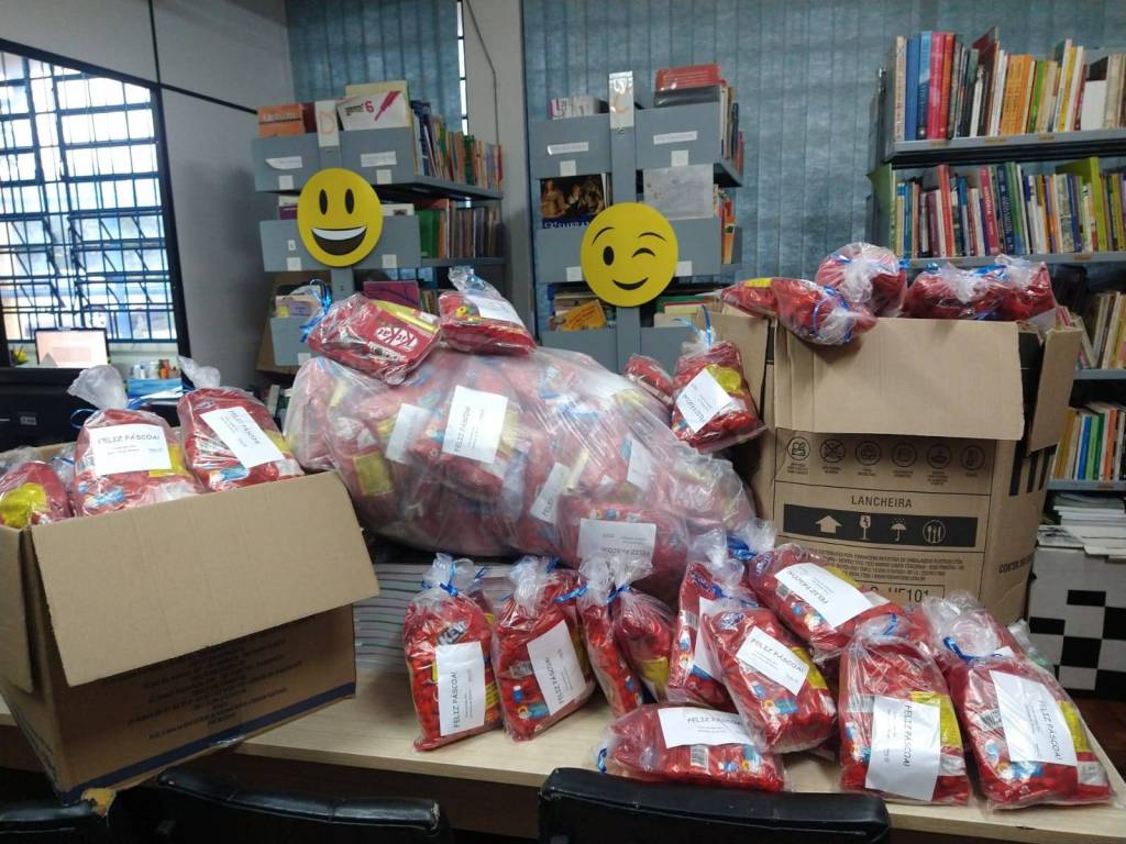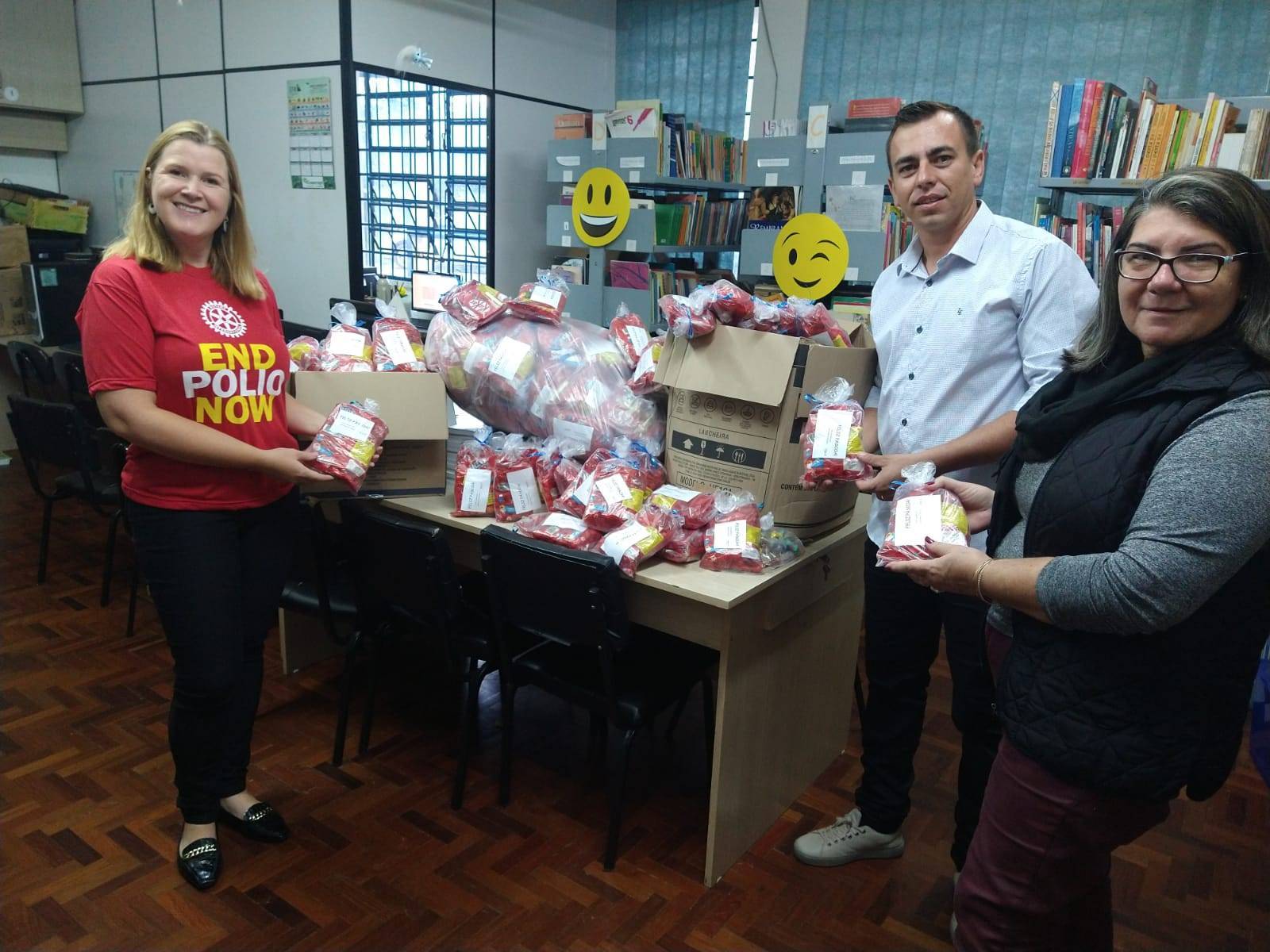 Os rotarianos do Rotary Club de Estrela, com a ajuda de alguns parceiros, doaram na manhã desta quarta-feira, 196 pacotinhos que serão distribuídos na Páscoa para os alunos da Escola Estadual de Ensino Fundamental Moinhos.